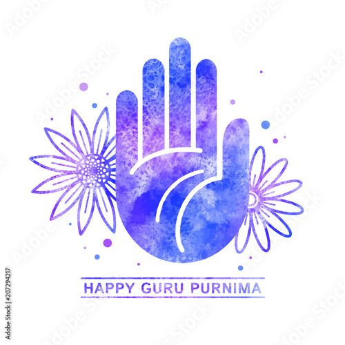 Happy Guru Purnima celebration greeting card template, watercolor illustration with flat style blessing hand, palm and stylized flowers. Watercolour texture, blue, lilac colorful aquarelle stains. - Buy this stock vector and explore