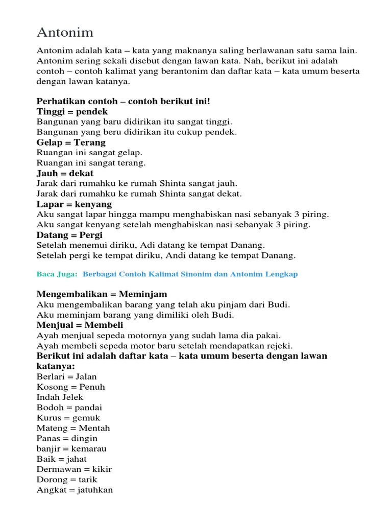 Contoh Sinonim Dan Antonim Kata Dalam Bentuk Kalimat