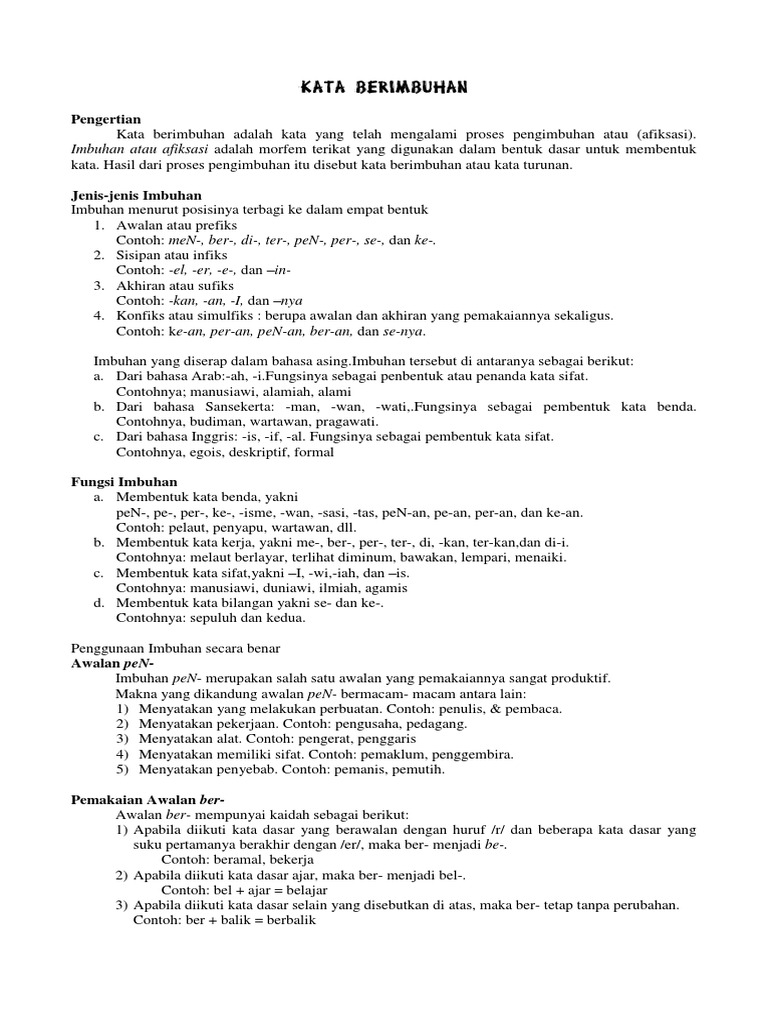 KATA BERIMBUHAN.doc - KATABERIMBUHAN 1 Pengertian Kata berimbuhan adalah kata yang telah mengalami proses pengimbuhan atau(afiksasi Imbuhan atau | Course Hero