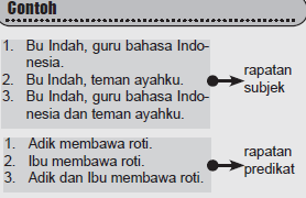 MODUL - ? ยท Kalimat majemuk rapatan a. Kalimat luas rapatan subjek Disusun dengan merapatkan subjek yang maujudnya sama lalu menghubungkan sisanya dengan konjungsi