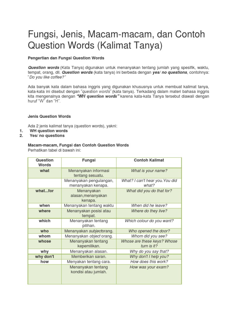 Contoh Question Words Serta Fungsinya Dalam Kalimat