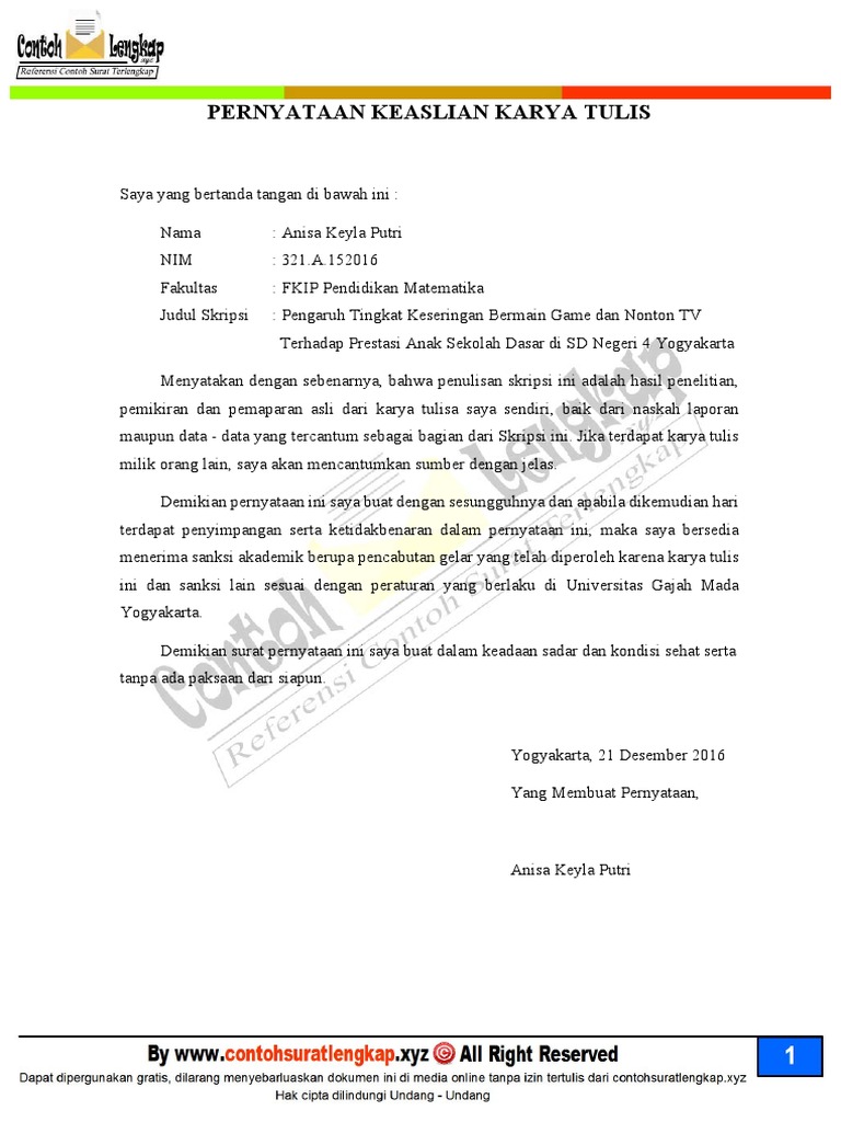 Contoh Surat Pernyataan Keaslian Skripsi