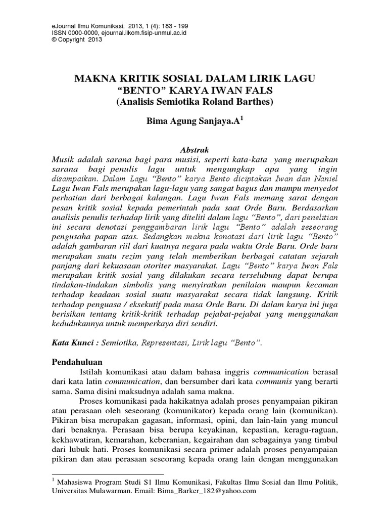 Makna Kritik Sosial Dalam Lirik Lagu ”Bento” Karya Iwan .Istilah komunikasi atau dalam bahasa inggris … Cinta adalah suatu yang sangat luas artinya dan … gaya bahasa maupun - [PDF Document]