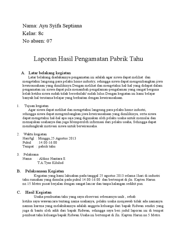 Contoh Laporan Hasil Kunjungan Ke Pabrik Tahu - Kumpulan Contoh Laporan