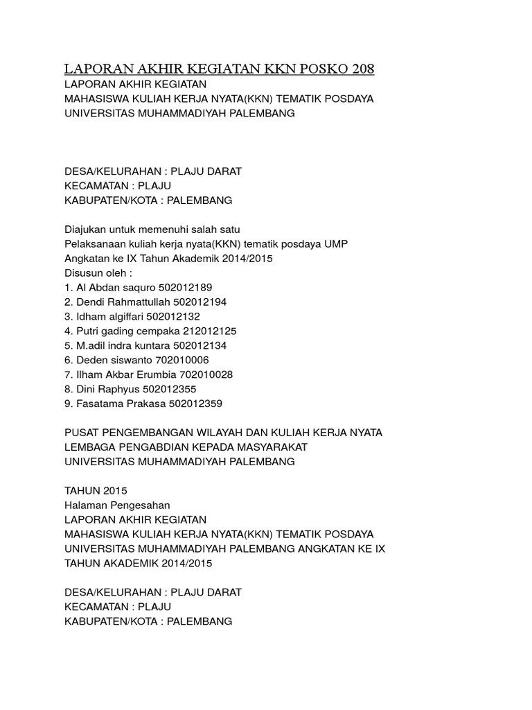 PDF) Sistematika Laporan KKN Laporan KKN disusun secara kelompok dengan sistematika sebagai berikut | Ecko Irawan - Academia.edu