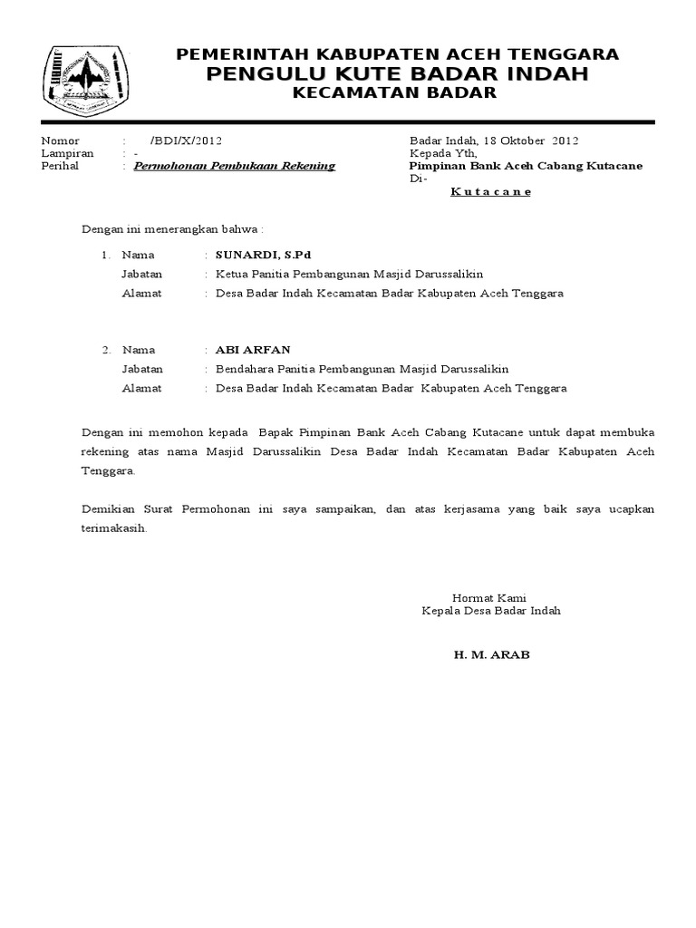 Surat Permohonan Buka Rek