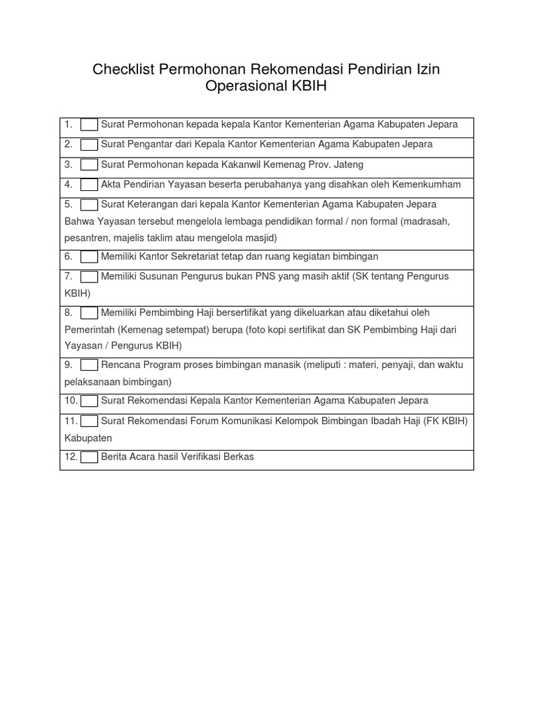 Checklist Permohonan Rekomendasi Pendirian Izin Operasional KBIH