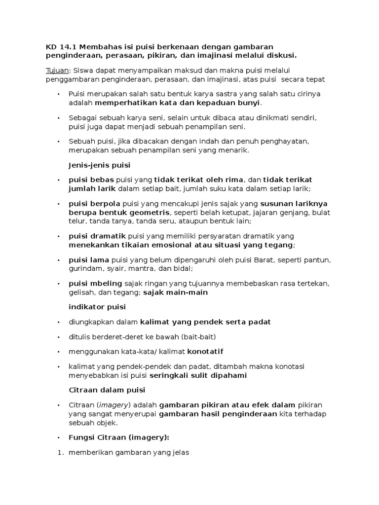 Bindo sepuluh II KD 14.1 Membahas isi puisi berkenaan dengan gambaran penginderaan, perasaan, pikiran, dan imajinasi melalui diskusi. Tujuan: Siswa dapat. - ppt download