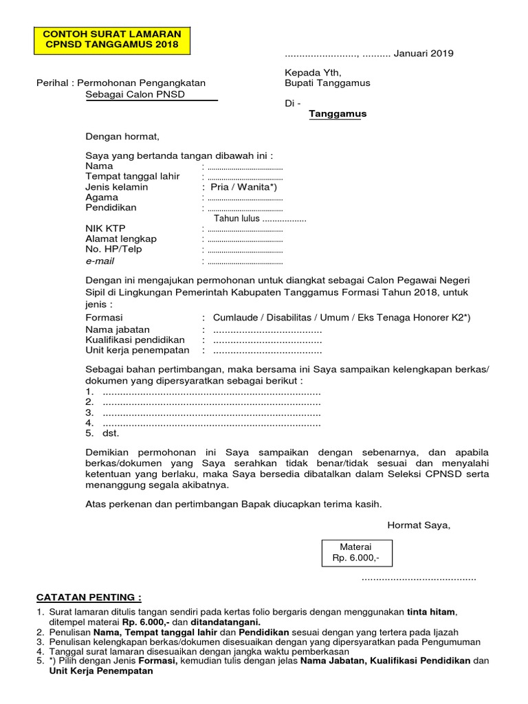 Contoh Surat Lamaran Pemberkasan CPNS Tanggamus Tahun 2018