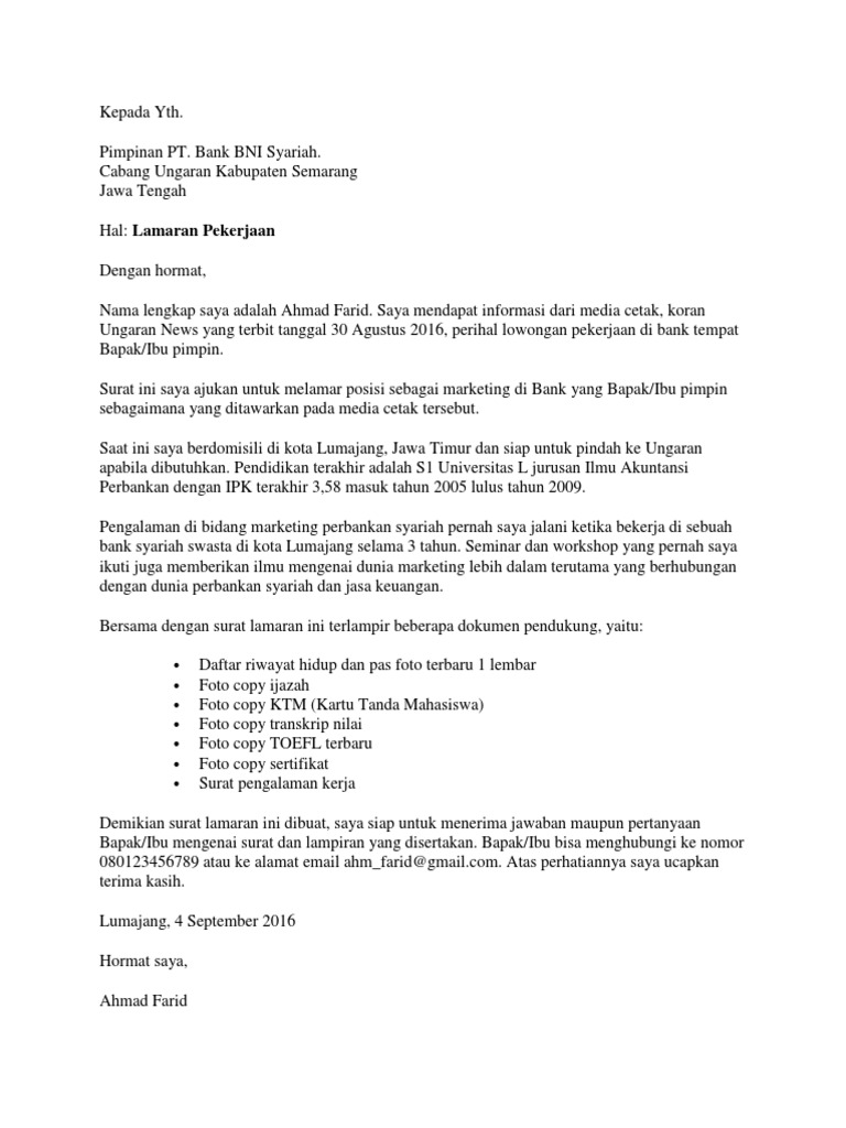 Contoh Surat Lamaran Kerja Di Bank Bni