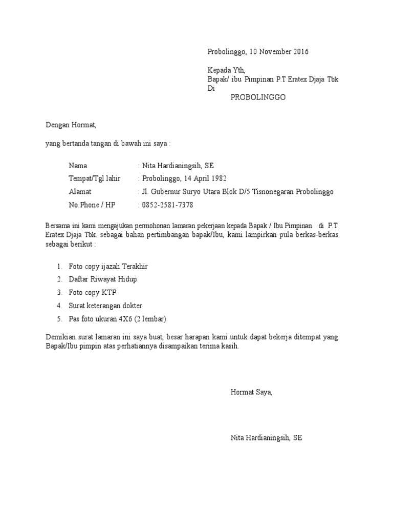 Contoh Surat Lamaran Kerja Eratex Probolinggo