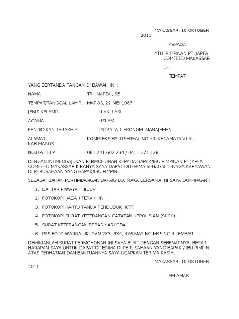 Contoh Surat Lamaran Kerja Di Pt Japfa