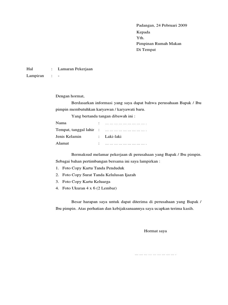 contoh surat lamaran kerja di restoran yang baik dan benar Sumber