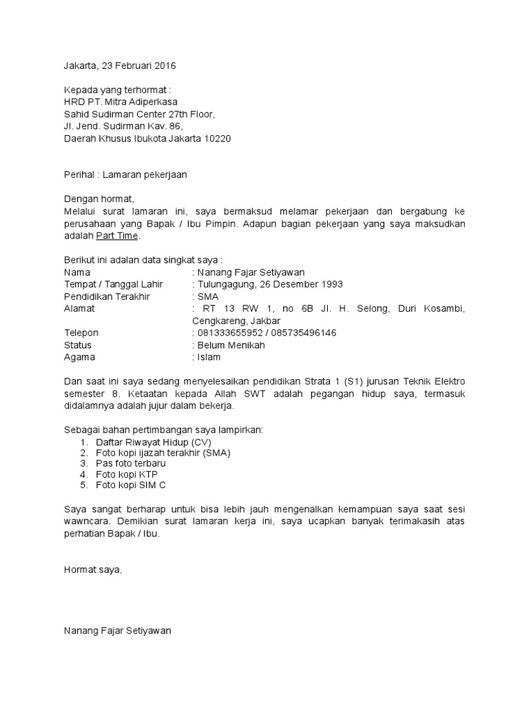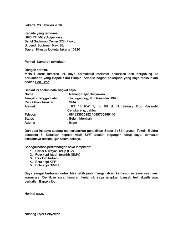 Contoh Surat Lamaran Kerja Part Time - Gawe CV