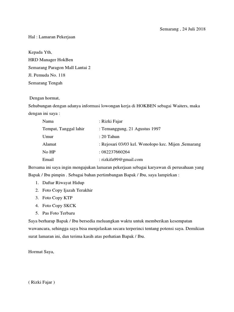 contoh surat lamaran kerja part time di hokben - Gawe CV