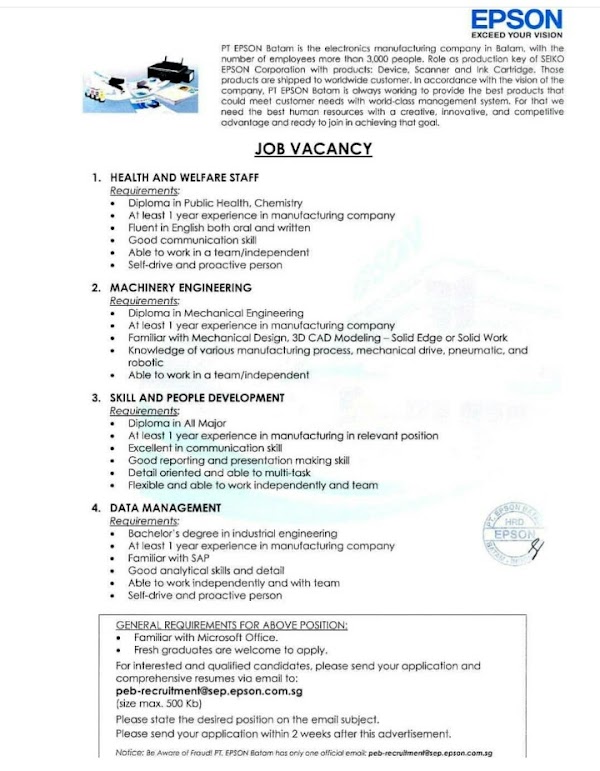 Lowongan Kerja Pt Epson Batam 2019