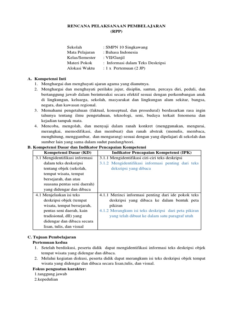 Rencana Pelaksanaan Pembelajaran (RPP): 3.1.2 Mengidentifikasi informasi penting dari teks deksripsi yang dibaca