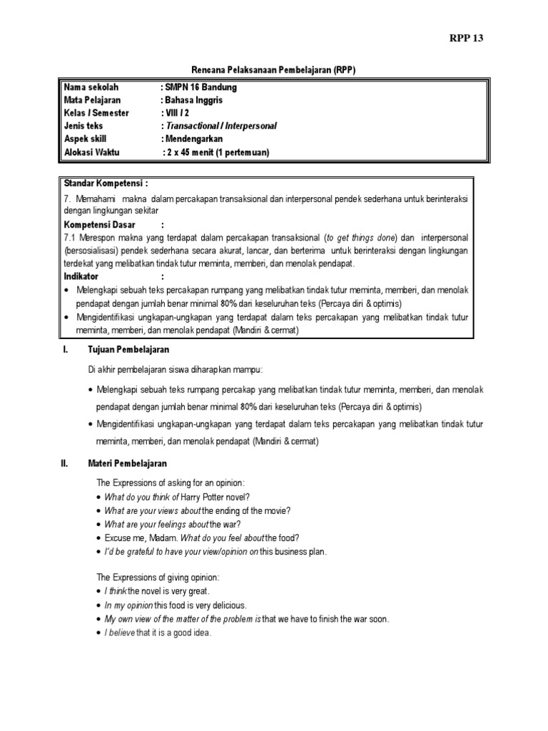 DOC) RPP bahasa Inggris kelas 2 SMP/MTs Asking Giving Opinion | Juswanto Jalal - Academia.edu