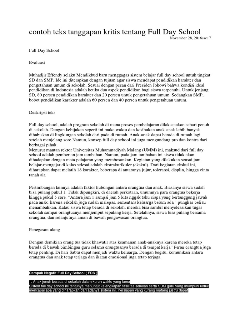 Contoh Teks Tanggapan Kritis Full Day School - Guru Ilmu Sosial