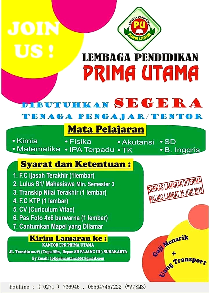 Lowongan Kerja Tenaga Pengajar Lembaga Pendidikan Prima Utama - Berbagai Mapel - Juni 2019 - Jatengloker