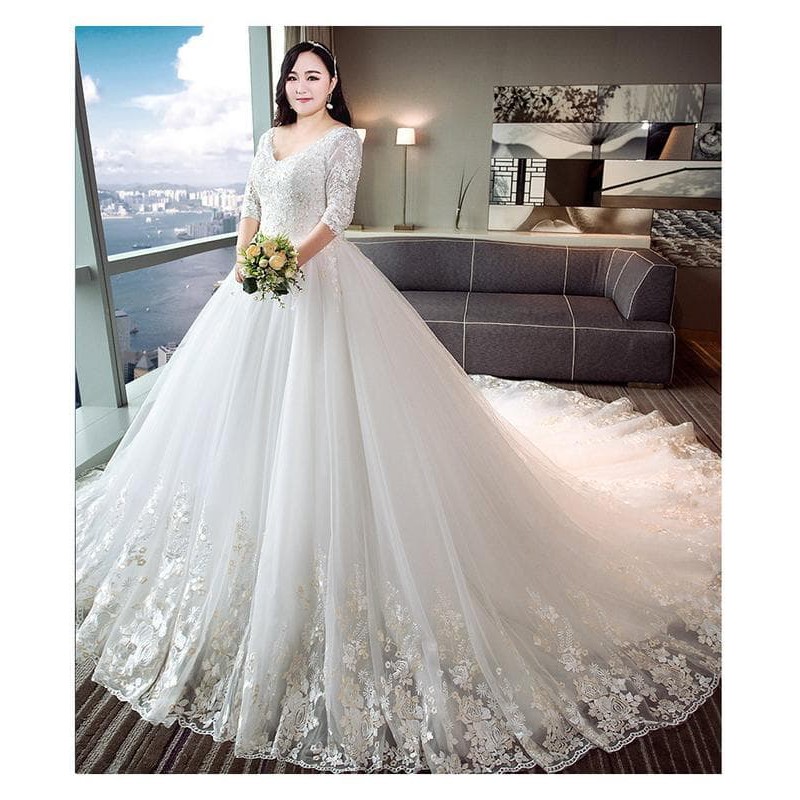 Gaun Pengantin 0530418 Putih Big Size Lengan Siku Ekor Wedding Gown | Shopee Indonesia