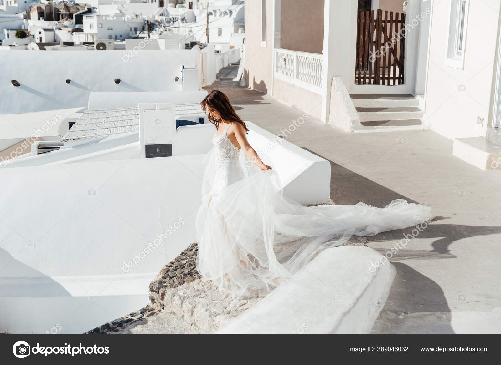 Pernikahan Pulau Santorini Yunani Pasangan Yang Cantik Pengantin Wanita Dengan — Stok Foto © Blokhin_Oleg@mail.ru #389046032