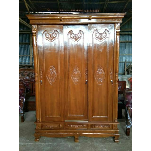 Lemari pakaian 3 pintu rahwana dan pluruh jati jepara Grade A kaki kambing pintu Sliding knockdown | Shopee Indonesia
