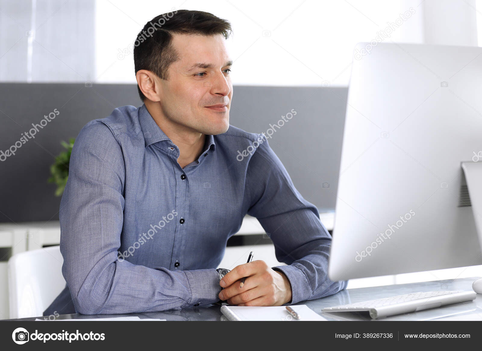 Pengusaha yang bekerja dengan komputer di kantor modern. Headshot pengusaha laki-laki atau direktur perusahaan di tempat kerja. Konsep bisnis — Stok Foto © rogerphoto #389267336