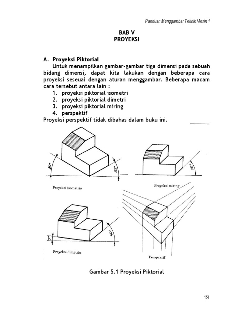 BAB V PROYEKSI A. Proyeksi Piktorial .Panduan Menggambar Teknik Mesin 1 19 BAB V PROYEKSI A. Proyeksi Piktorial Untuk menampilkan gambar-gambar tiga dimensi pada - [PDF Document]