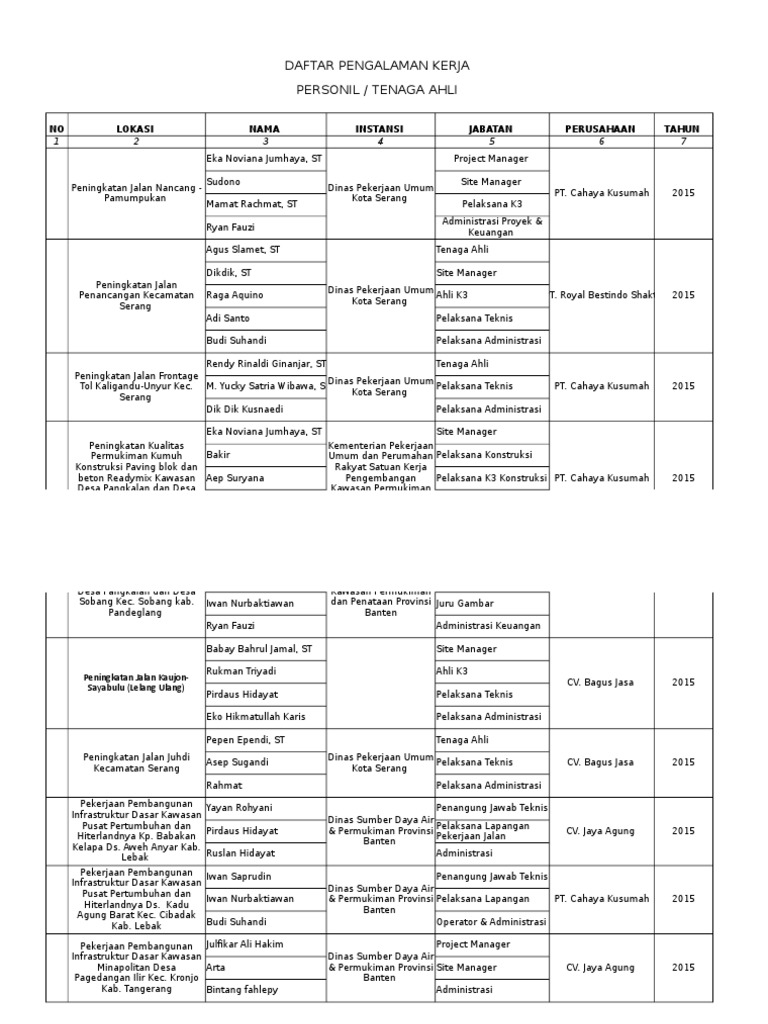 Daftar Pengalaman Kerja Personil