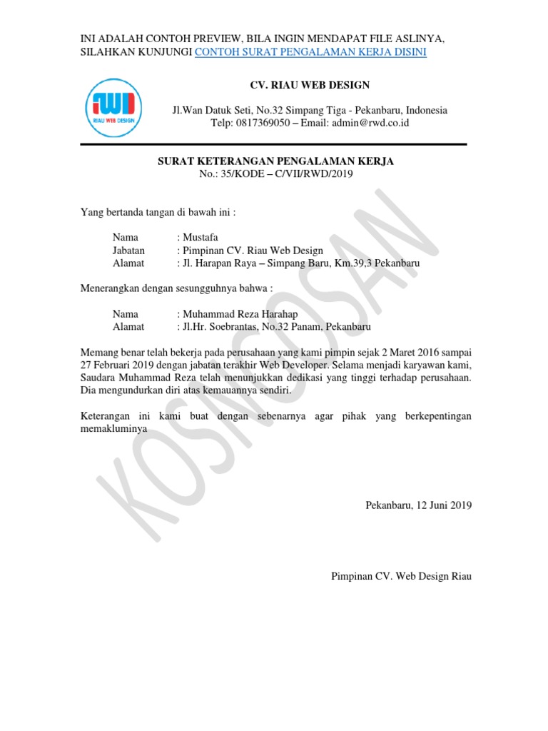 Contoh Surat Pengalaman Kerja