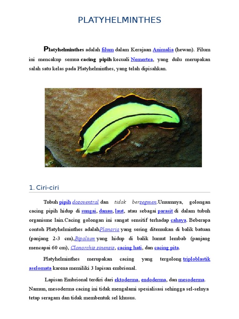 Ciri-ciri Platyhelminthes (cacing pipih) sebagai berikut – Hisham.id
