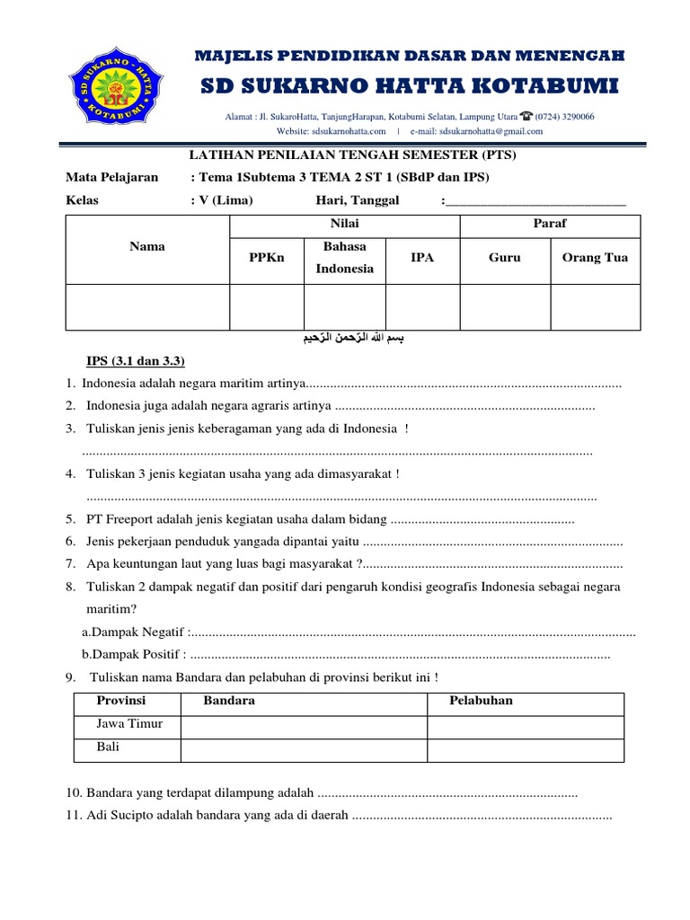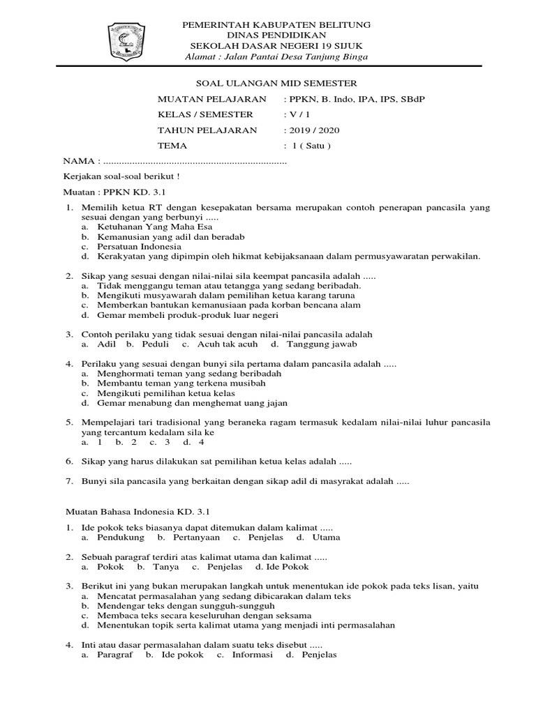 Soal Ulangan Mid Semester kelas 5 k13
