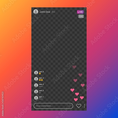 Instagram stream interface. Social media live streaming service, mobile app frame UI, live video. Vector stories UI broadcast design images template - Buy this stock vector and explore similar vectors at Adobe