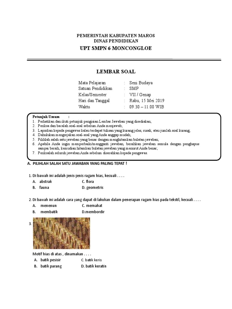Pendidikan Dan Pembelajaran: Soal Pilihan Ganda Ragam Hias (Seni Budaya SMP kelas 7)