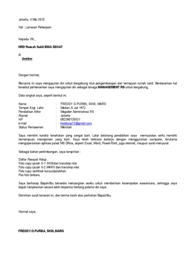 Contoh Surat Lamaran Kerja Di RS