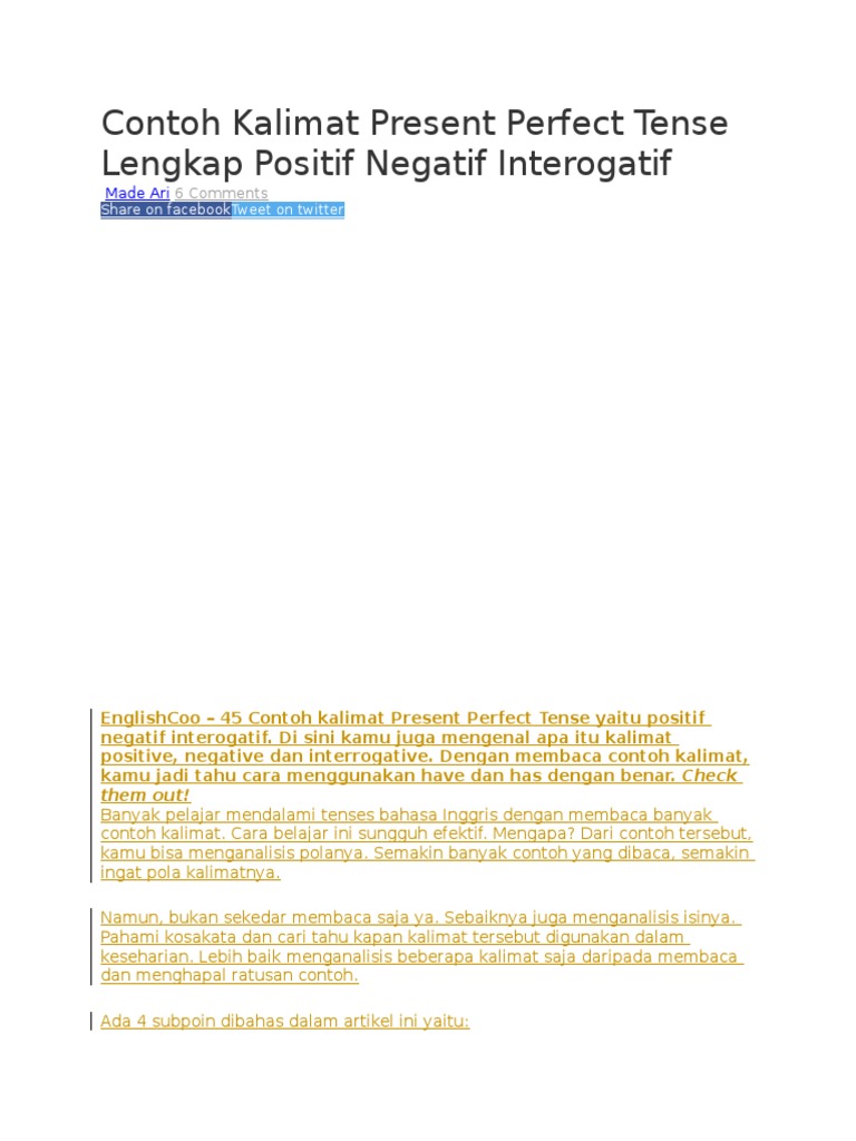 Contoh Kalimat Present Perfect Tense Lengkap Positif Negatif Interogatif