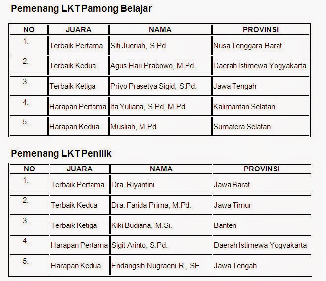 Daftar pemenang Apresiasi PTK PAUDNI Berprestasi Tahun 2014 untuk jenis PTK PAUD | ANAK PAUD BERMAIN BELAJAR
