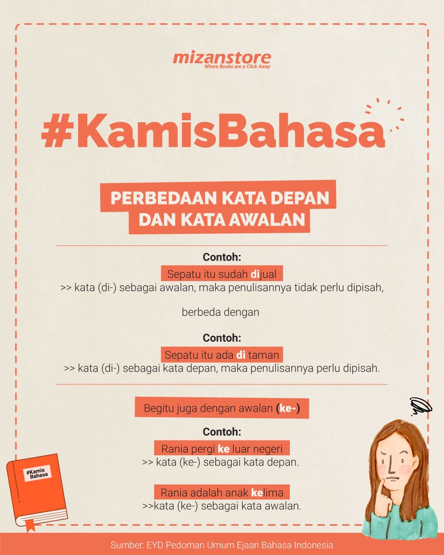 Mizanstore ar Twitter: “Hayooo siapa yang masih salah penempatan kata depan dan kata awalan? Kalau ada yang mau ditanyain lagi seputar kata depan dan awalan. Boleh banget diskusi di kolom komen! #KamisBahasa #