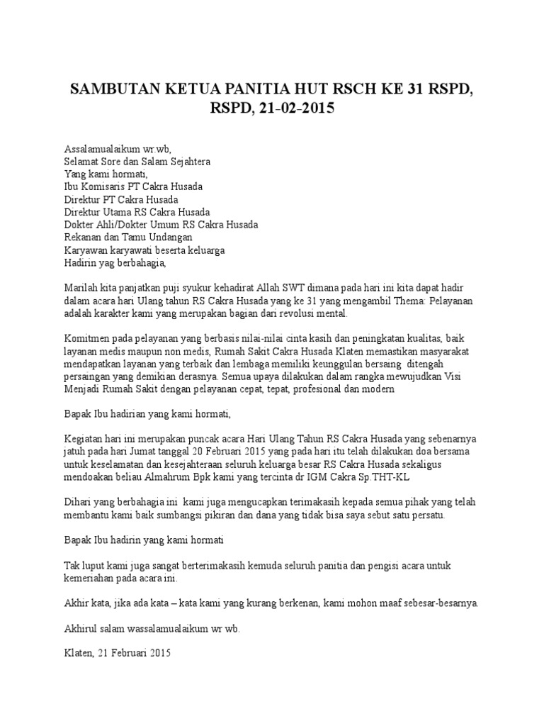 Sambutan Ketua Panitia Hut Rsch Ke 31 Rspd