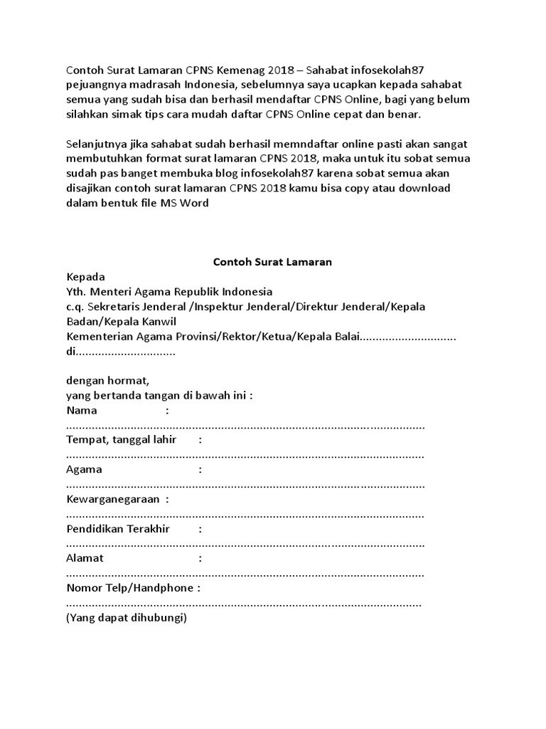 DOC) Contoh Surat Lamaran CPNS Kemenag 2018 Gratis | Abdul Rahmanzakiy - Academia.edu
