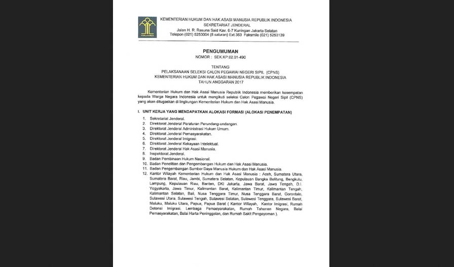 Berikut Pengumuman Lengkap Formasi CPNS di Kementerian Hukum dan HAM dan Mahkamah Agung