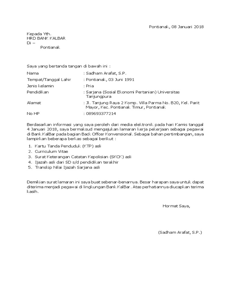 Contoh Surat Lamaran Kerja Di Bank Dalam Bahasa Indonesia