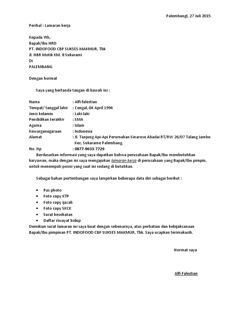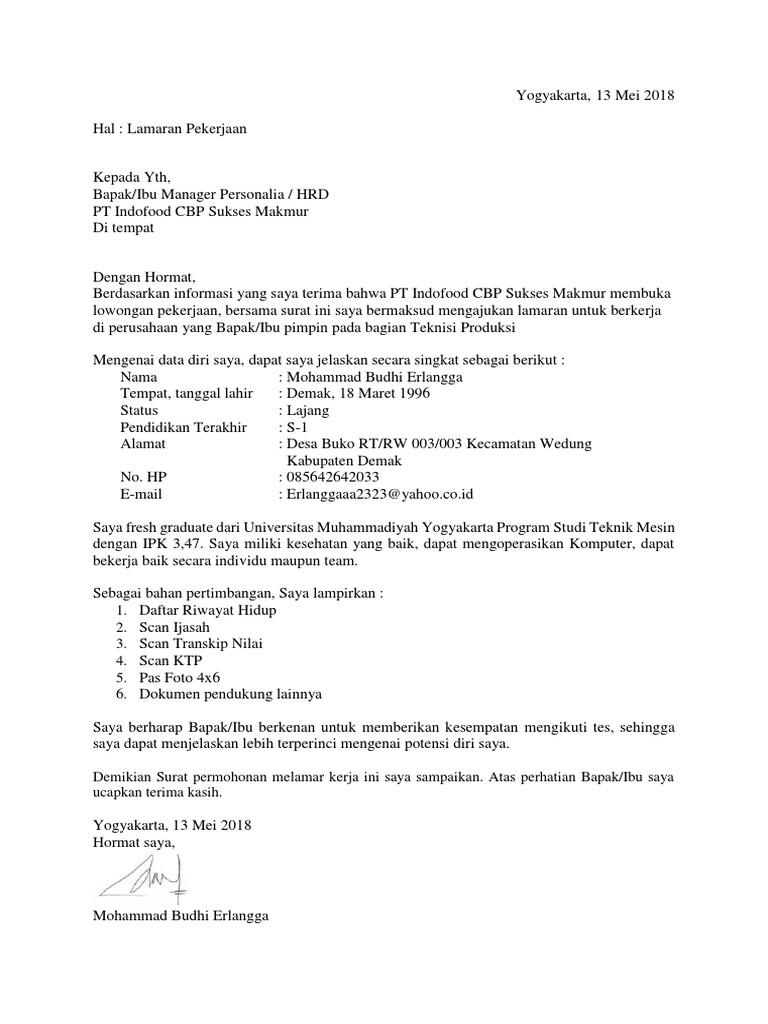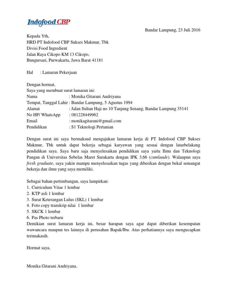 Contoh Surat Lamaran Kerja Di Pt Indofood