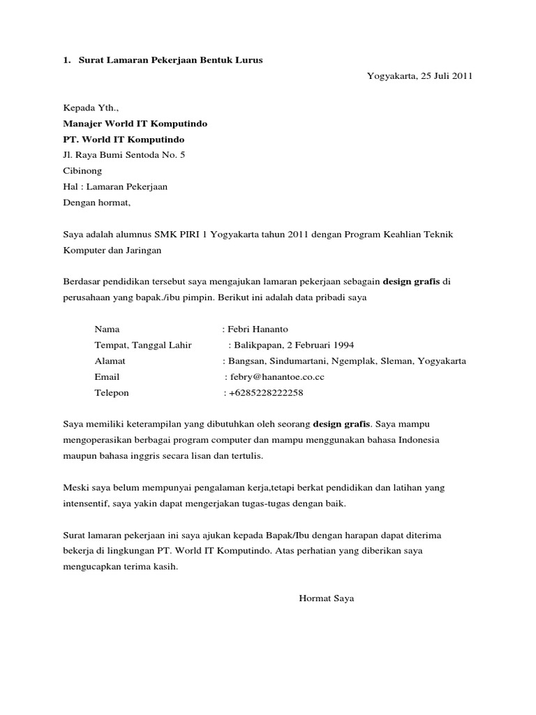 Contoh Surat Lamaran Kerja Bentuk Setengah Lurus