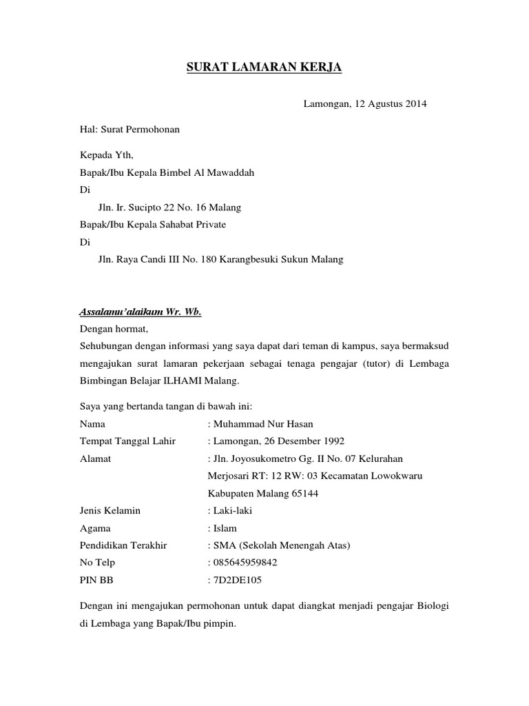 Contoh Surat Lamaran Kerja Les Private Bernitoh – Cuitan Dokter