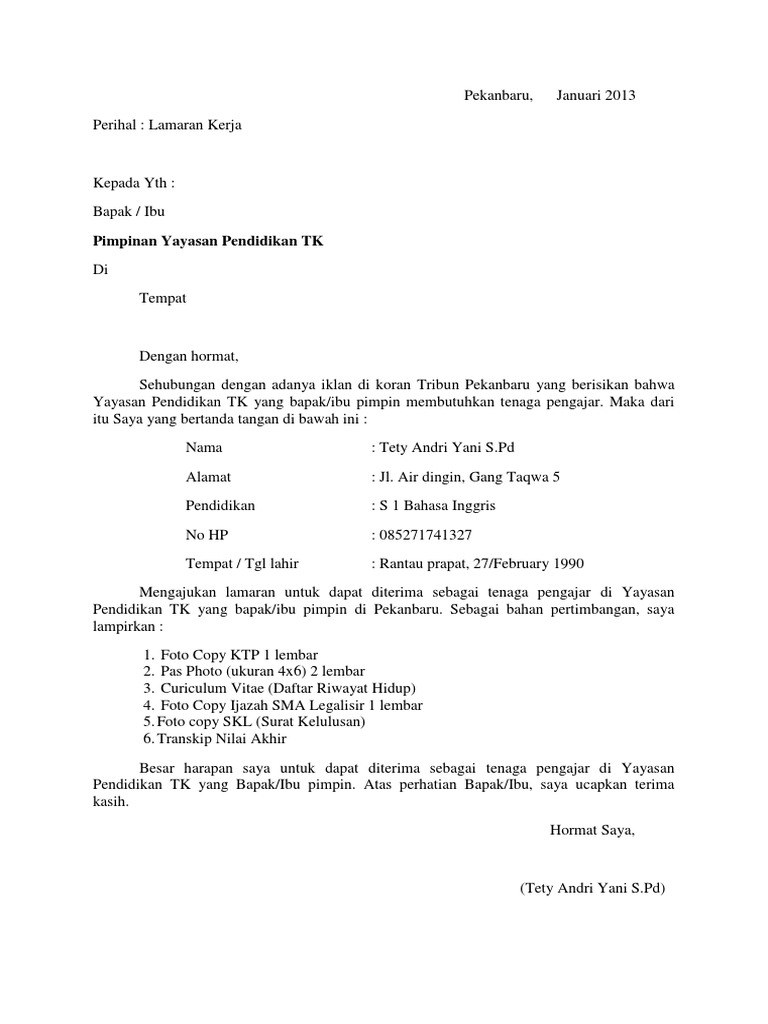 Contoh Surat Lamaran Kerja Guru Bimbel - Gawe CV