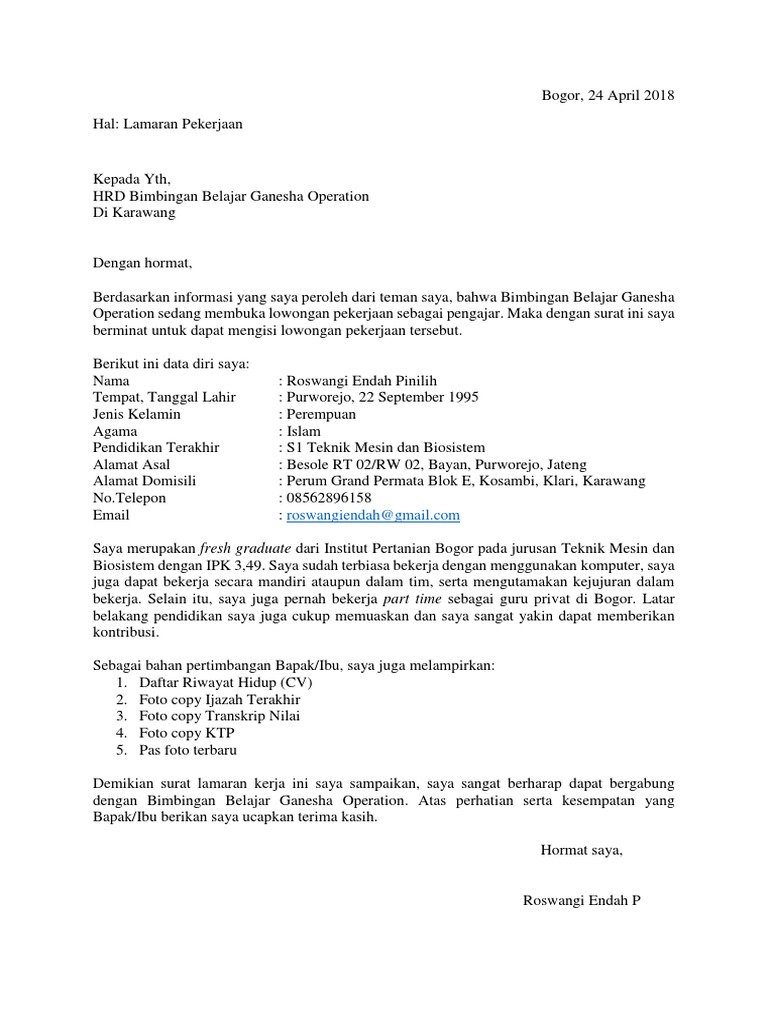 Contoh Surat Lamaran Mengajar Di Ganesha Operation