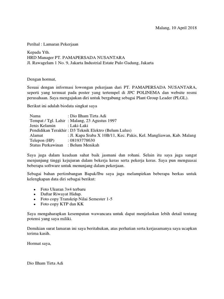 Contoh Surat Lamaran Kerja Di Pt Pama
