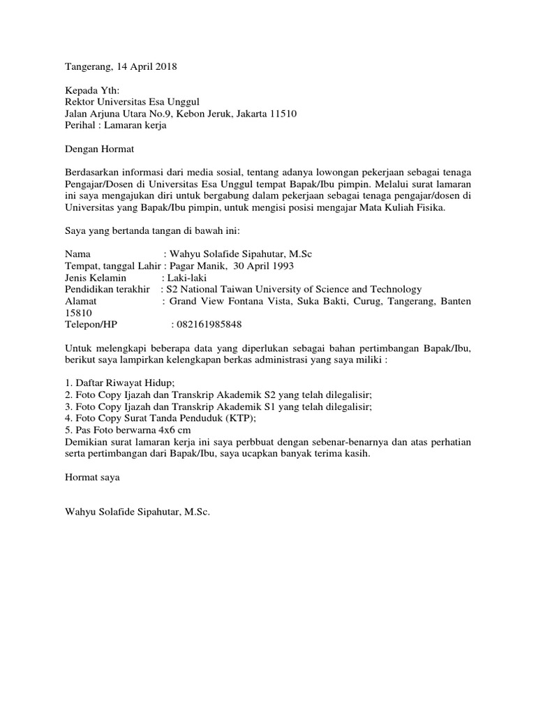 Contoh Surat Lamaran Kerja Sebagai Dosen Di Universitas - Dapatkan Contoh